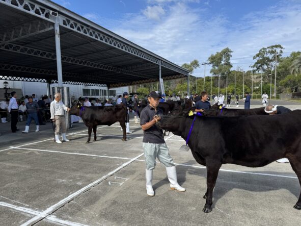 淡路市と洲本市の共進会で勝ち上がってきた62頭が10月26日の兵庫県畜産共進会を目指して牛馬一体となって講評を待っています。